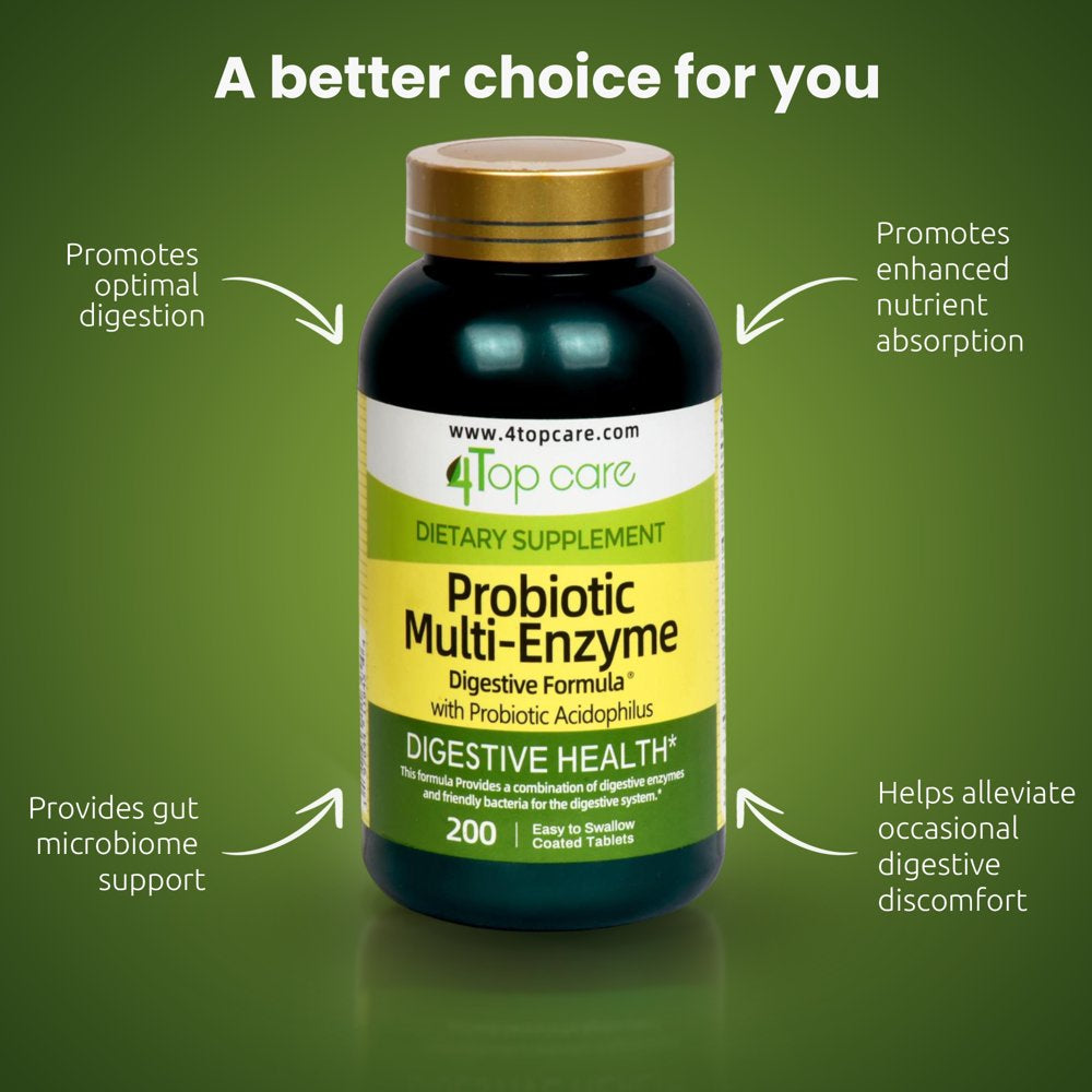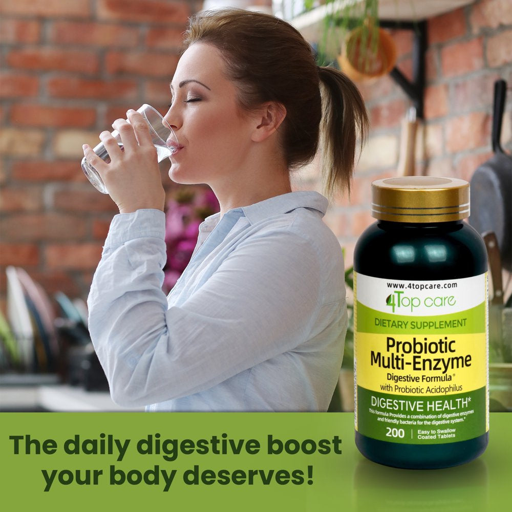 4 TOP CARE Probiotic Multi-Enzyme Digestive Formula Tablets with probiotic acidophilus is formulated to promote healthy digestion.* It contains a combination of digestive enzymes such as betaine hydrochloride, pancreatin, amylase, protease (papaya enzyme), bromelain, papain (papaya enzyme), pepsin, ox bile, lipase, cellulase, and friendly bacteria lactobacillus acidophilus La-14. These tablets contain no artificial colors or flavors, artificial sweeteners, preservatives, egg, high fructose corn syrup, lactose, milk or milk derivatives, peanuts, sodium (less than 5 milligrams), fish, shellfish, talc, or trans fat. The recommended adult dosage is three tablets daily with food. You can rest assured that the 4 TOP CARE Probiotic Multi-Enzyme Digestive Formula Tablets Dietary Supplement is produced with strict quality guidelines and is backed by our quality guarantee.