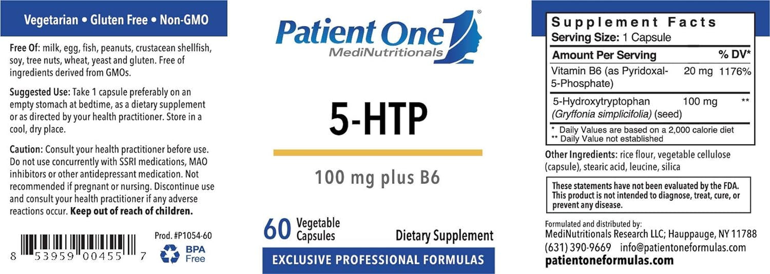 Patient One 5-HTP with B-6 provides 5-hydroxytryptophan (100 mg) and vitamin B-6 (20 mg) per serving to support overall neurotransmitter metabolism by providing precursors of serotonin. 5-HTP readily enters the blood–brain barrier; however, conversion into serotonin requires the cofactor vitamin B-6, which is included in this formula. 5-HTP may be used during the day to support a healthy mood and normal appetite, or it may be used at bedtime to support sleep.