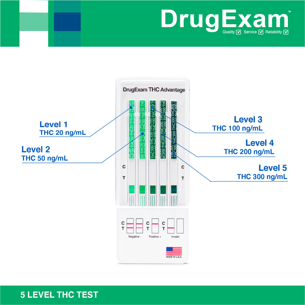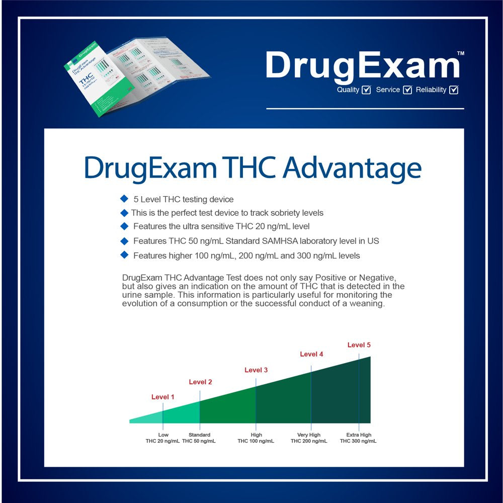 DrugExam THC Advantage Made in USA Multi Level Marijuana Home Urine Test Kit. Highly Sensitive THC 5 Level Drug Test Kit. Detects at 20 ng/mL, 50 ng/mL, 100 ng/mL, 200 ng/mL and 300 ng/mL