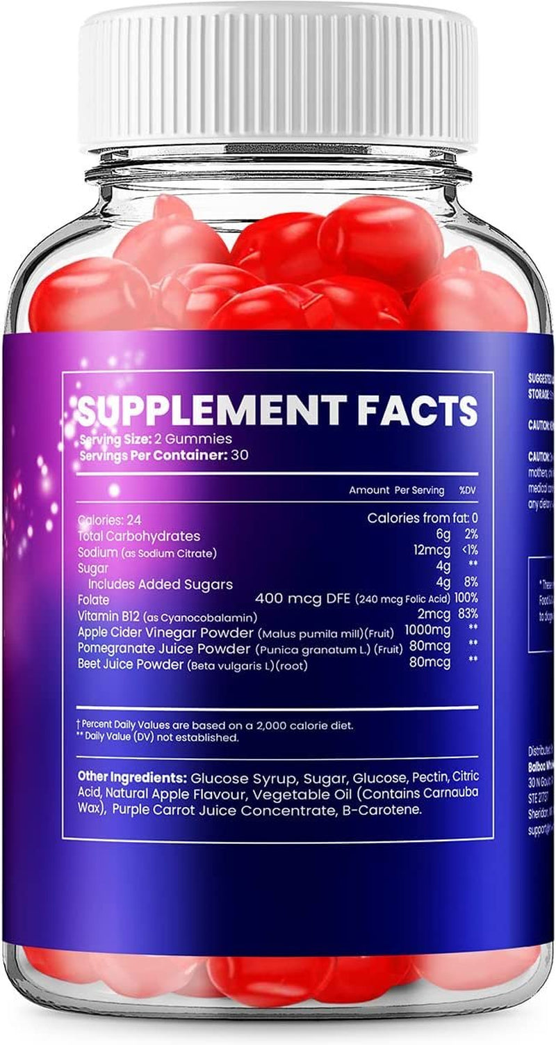 Ingredients:Apple Cider Vinegar, Beet Juice, Beet Root, Pectin, Citric Acid, Folic Acid, Pomegranate, Vitamin B12, Sodium Citrate, Glucose, Sugar, Glucose Syrup, Natural Apple Flavor, Vegetable Oil, Carrot Concentrate, Beta Carotene, Carnuba Wax
