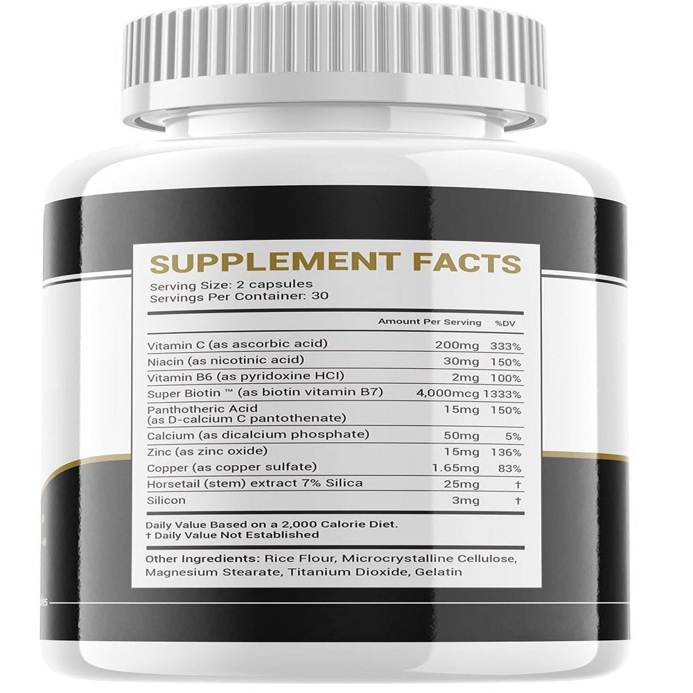 Vitamin C, Niacin, Vitamin B6, Super Biotin (as biotin vitamin B7), Panthotheric Acid, Calcium (as dicalcium phosphate), Zinc, Copper (as copper sulfate), Horsetail (stem) extract 7% Silica, Silicon. Other Ingredients: Rice Flour, Microcrystalline Cellulose, Magnesium Stearate, Titanium Dioxide, Gelatin./div>