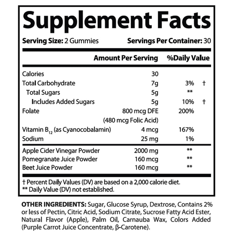 - ADDED INGREDIENTS: Our proprietary blend of apple cider vinegar gummies contain beet root, vitamin b12 and folate.