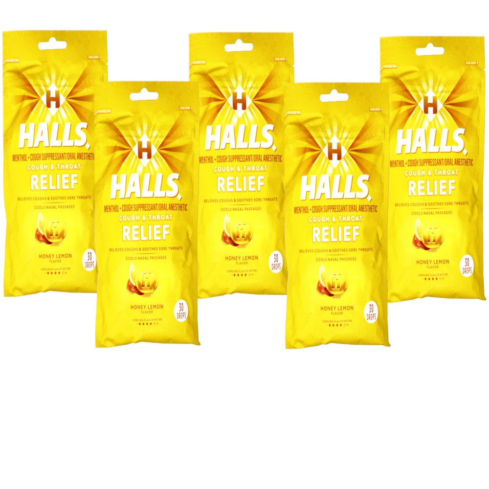 HALLS Relief Honey Lemon Cough Drops are ready for whatever life throws, or coughs, your way. With 7.5 mg of menthol per drop, these throat lozenges relieve coughs, soothe sore throats and cool nasal passages to relieve your worst symptoms. This effective cough suppressant comes in a refreshing yet soothing honey lemon flavor. Whether you're using HALLS cough drops for sore throat relief, cough relief or as an oral anesthetic, simply dissolve one drop in your mouth slowly, and repeat every two hours as needed. HALLS Relief cough drops are formulated for adults and children five years and older. Each economy sized bag comes with 30 individually wrapped drops and is resealable, making it ideal for stowing in your travel pack, purse or desk drawer. These packs are also perfect inclusions in a healthy gift or care package.