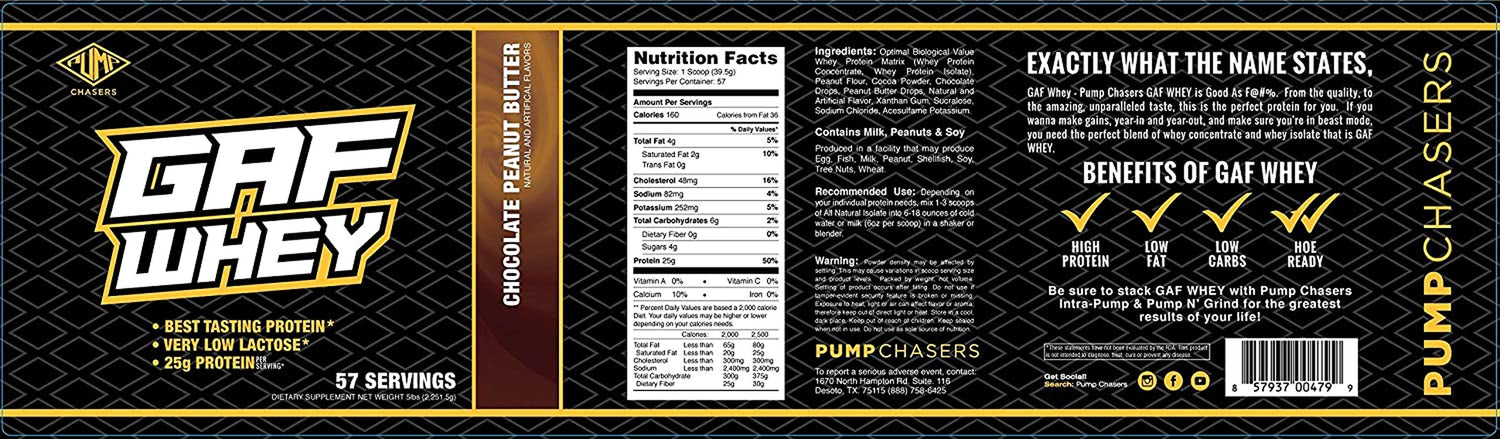 Pump Chasers GAF WHEY is exactly what the name states, it is Good As F@#%. From the quality to the amazing, unparalleled taste, this is the perfect protein for you. The perfect blend of Whey Concentrate and Isolate, GAF Whey ensures that you get the active biological fractions in the whey concentrate but also keep the carbs and fat low with the isolate.