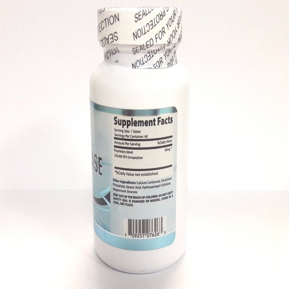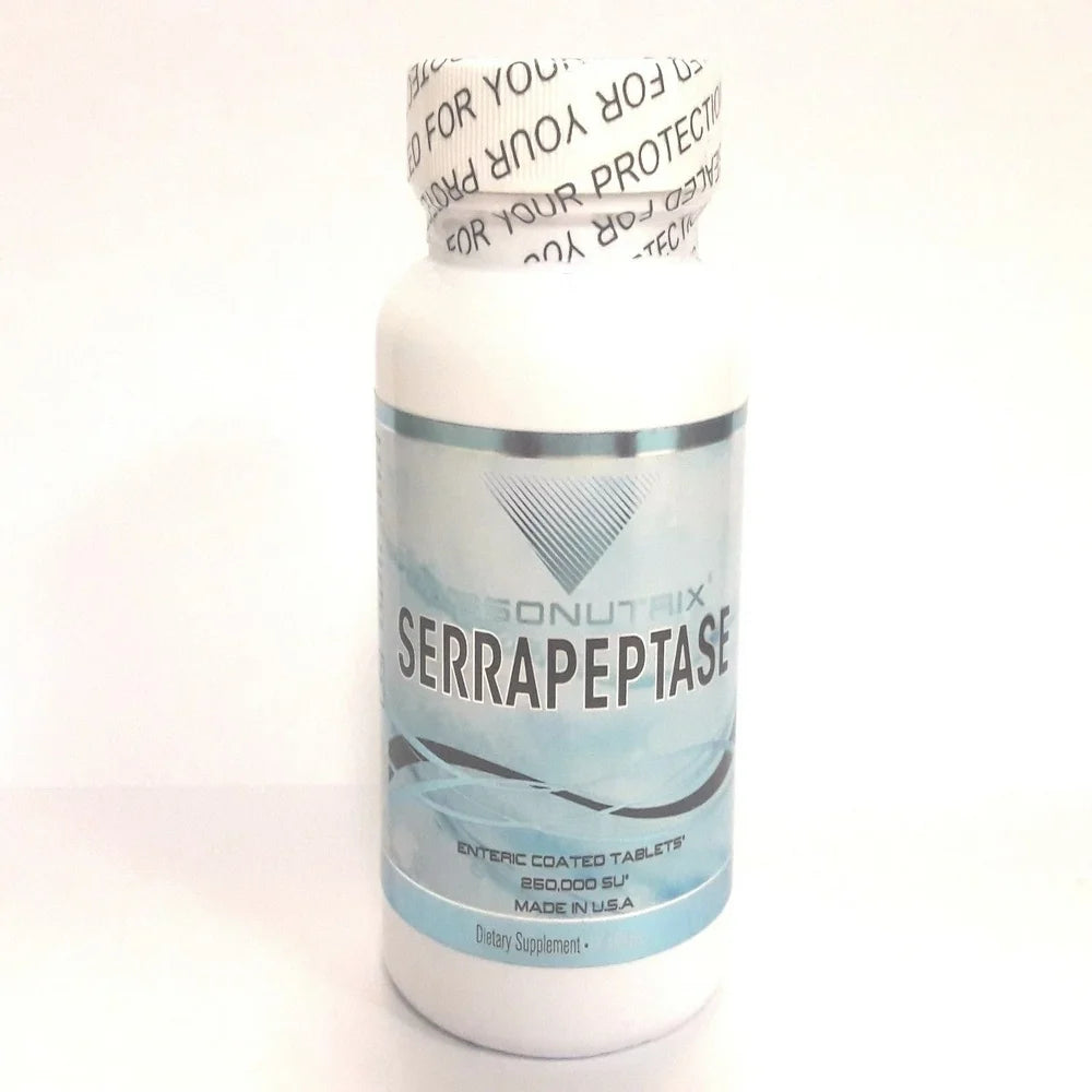 Serrapeptase is a proteolytic enzyme isolated from the bacteria found in the intestines of silkworms. Proteiolytic means that this product breaks down protein into smaller components that can be easily used by our body. Serrapeptase has ability of breaking down non-living tissue in the body and as a result may help in various conditions involving pain and swelling.Features• 60 Enteric coated Tablets• 250,000 SU serrapeptase• Each serving provides 60 mg of proprietary blend• Made in USAAbsonutrix Serrapeptase provides 250,000 serratopeptidase units in each tablet.Suggested UseAdults take one (1) tablet three times a day, 30-60 minutes before , or two hours after a meal. Take with an 8 Oz of water. Take for 2 weeks, then reduce dosage to one (1) tablet twice daily for 2 weeks. Do not exceed six (6) tablet in one day.Caution: Do not use if pregnant, nursing or taking any medications. Consult your doctor prior to use if you have any medical condition.* These statements have not been evaluated by the FDA. This product is not intended to diagnose, treat, cure or prevent any disease. The supplements are not meant for pregnant women or breast feeding mothers and should always be taken after doctor’s consent.