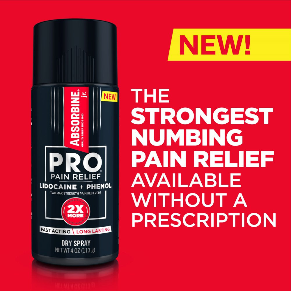 - INSTANT PAIN RELIEF - Absorbine Jr. PRO Max Strength Dry Spray is the strongest numbing pain relief available without a prescription. Formulated with 4% Lidocaine and 1.5% Phenol, this instant spray penetrates deeply for long lasting relief of nerve pain, muscle aches and pains, joint discomfort and more.