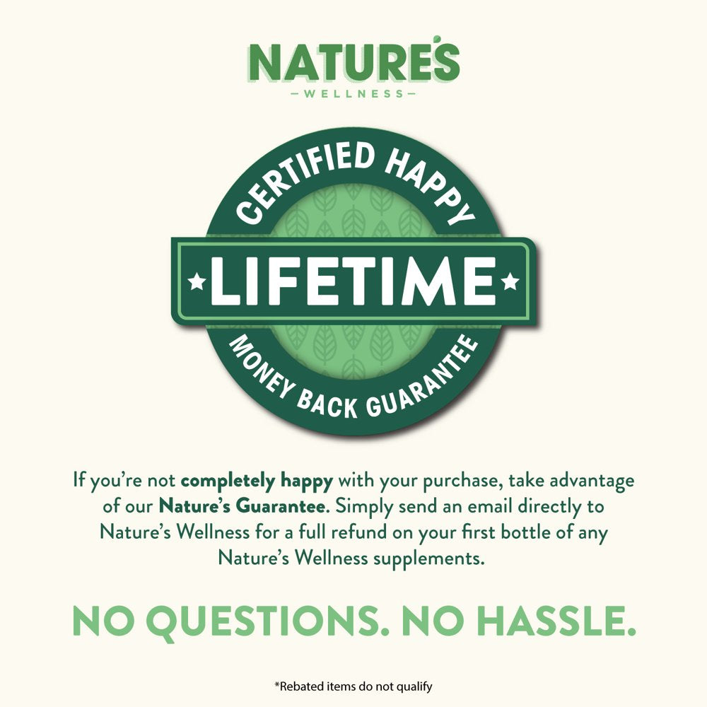 - Lifetime money back guarantee on the first bottle of all Nature's Wellness Market products. Go ahead and give it a try risk free.