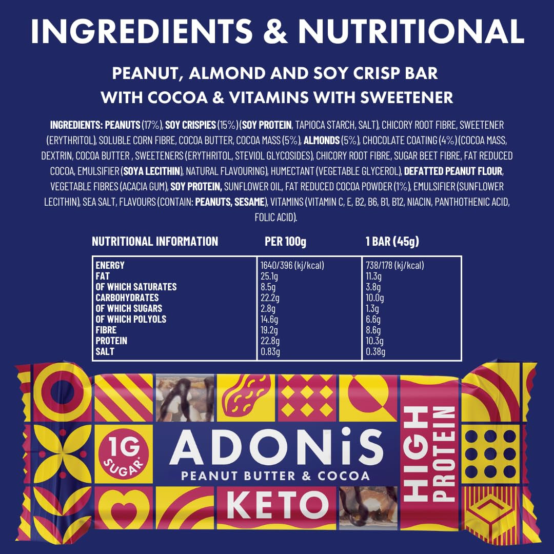 - ABOUT THE ADONIS PEANUT BUTTER & CHOCOLATE HIGH PROTEIN KETO BARS: Our Peanut Butter and Chocolate keto bars cover all bases- the perfect snack for pre and post working, an afternoon snack- this bar is perfect for every occasion! With a smooth peanut butter centre and the crunchy peanuts- this indulgent high protein bar will leave you feeling satisfied and energised!