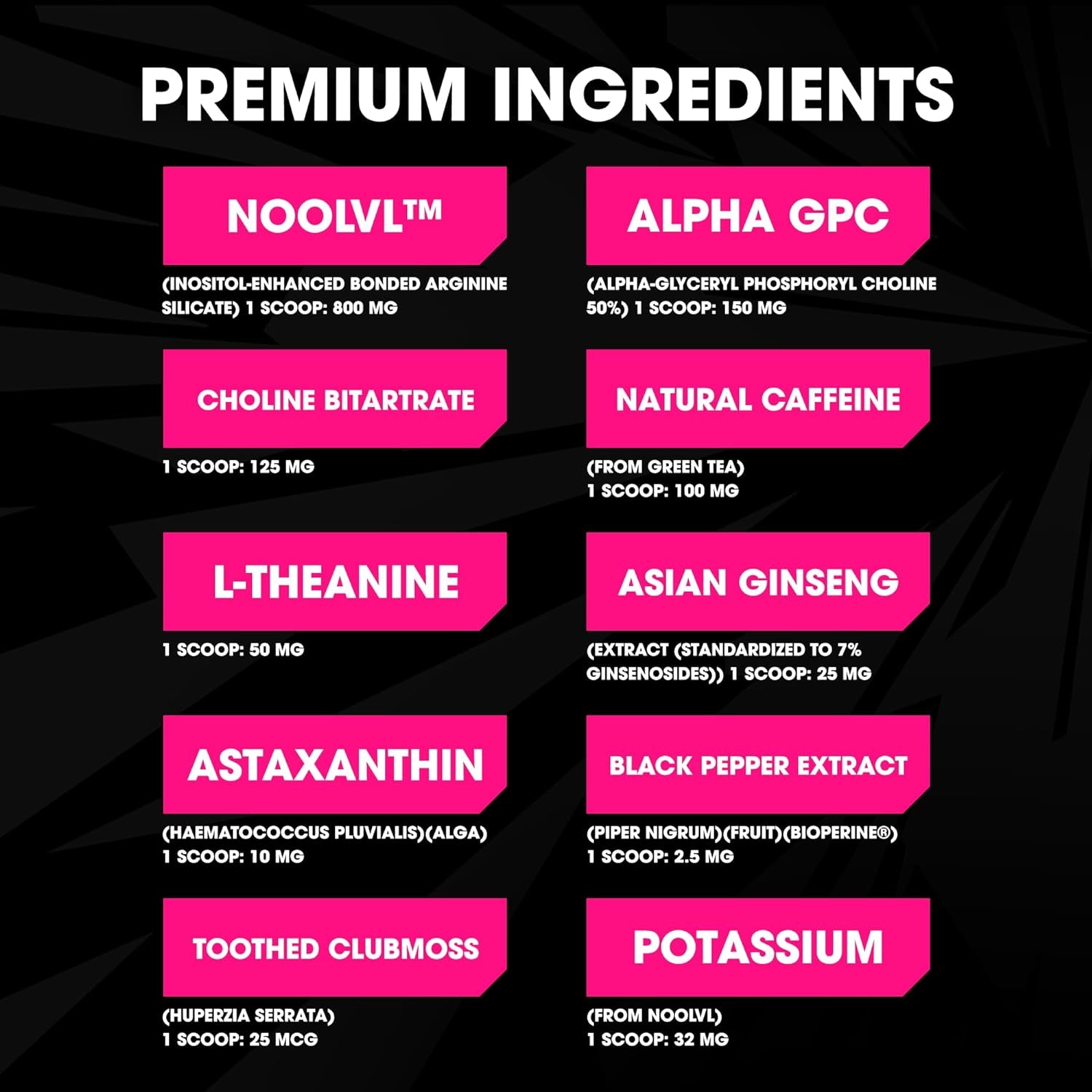 - Full Lineup of Nootropics β Focus is packed with ingredients that have been shown to help your mind work at peak performance. Huperzine from Toothed Clubmoss, Alpha GPC, L-Theanine, and Panax Ginseng all work to improve cognitive function without giving you the jitters or sweaty palms.