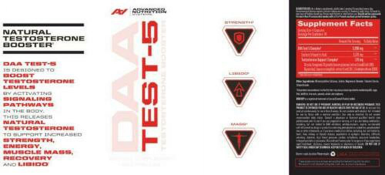 DAA Test 5 is a Natural Testosterone Booster Designed to boost testosterone levels by activating signaling pathways in the body to release natural testosterone, thus increasing strength, energy, muscle mass, recovery and libido. Bottles with (96) easy-to-swallow capsules.