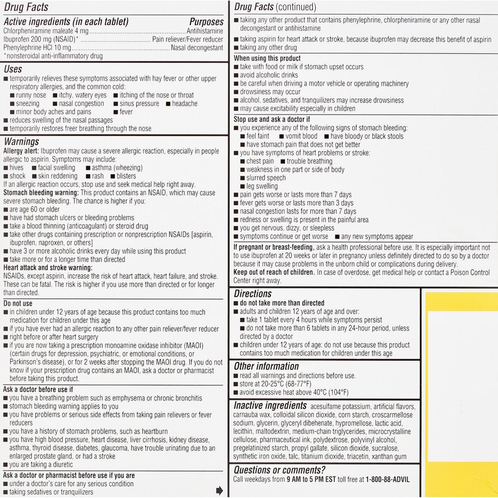 Advil Allergy and Congestion Relief stops tough allergy and sinus symptoms in their tracks. This allergy and sinus medicine delivers multi-symptom relief in one pill. Each dose contains ibuprofen 200mg—an anti inflammatory pain reliever and fever reducer that fights headache, fever and body aches. Phenylephrine HCl 10mg—a nasal decongestant—and chlorpheniramine maleate 4 mg—an antihistamine— work together to control runny nose, sneezing, sinus pressure, nasal congestion and swelling, and itchy, watery eyes. Just one of these tablets helps control your tough allergy and sinus symptoms for four hours. These allergy relief tablets are easily portable, keeping you ready whenever allergy and nasal sinus pressure symptoms strike. Trust Advil to control your allergy and sinus symptoms.