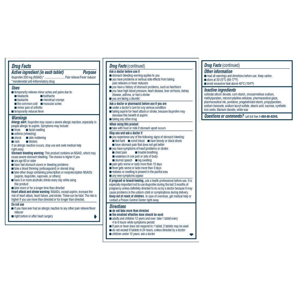 Advil stops pain where it starts, providing a powerful pain reliever. Whether you have a headache, muscle ache, backache, toothache, menstrual pain, minor arthritis and other joint pain, or aches and pains from the common cold, Advil brings relief where you need it. This fever reducer and pain medicine for adults is scientifically designed to block the chemicals in the body that cause pain and fever. Each tablet contains ibuprofen 200mg, a non-steroidal anti-inflammatory drug (NSAID). Coated Advil tablets are easy to swallow, providing relief that lasts for up to 6 hours. One Advil is all it often takes for headache relief, muscle ache relief, joint pain relief, or minor arthritis pain relief, and the medicine in Advil is what doctors use most for their own aches and pains. The world's best-selling ibuprofen brand, Advil has provided safe, effective pain relief for over 35 years. Nothing's stronger on tough pain than Advil. (1)