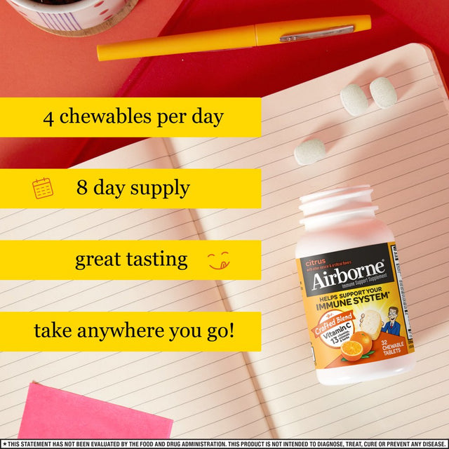 Airborne Vitamin C chewable Zinc tablets are packed with 1000mg Vitamin C per serving, which helps support your immune system.* These Chewable Vitamin C with Zinc tablets contain 73% of your daily value of Zinc, which plays a central role in your immune system and is essential for the functioning and signaling of immune cells.* Airborne immune support chewable tablets contain the powerful antioxidants Vitamin A (to support immune health), Vit C (to support immune health) and Vitamin E (to help fight free radicals).* This crafted blend of 13 immune support vitamins, minerals & herbs and is an excellent source of Zinc and Selenium.Airborne is the #1 Immune Support Gummy, Effervescent & Chewable Brand.1 Don’t take our word for it, check out our 5-star rating and read our customer reviews.These refreshing, Citrus flavored, chewable Vitamin C tablets are convenient and easy for adults and for kids 12+ to take at home or on the go. Adults & children 12 years of age and older: Chew (4) tablets a day. One serving of (4) chewable tablets provides 1000mg of VITAMIN C!*These statements have not been evaluated by the Food and Drug Administration. This product is not intended to diagnose, treat, cure or prevent any disease.1Based on unit sales L52W for years 2018-2024.