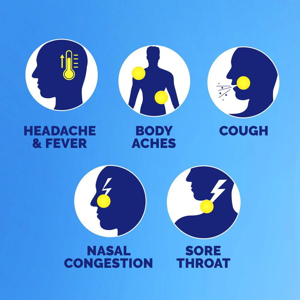 - Provides powerful multi-symptom relief from nasal congestion, cough, headache, chest congestion, body ache, sore throat, sinus pressure & congestion and fever