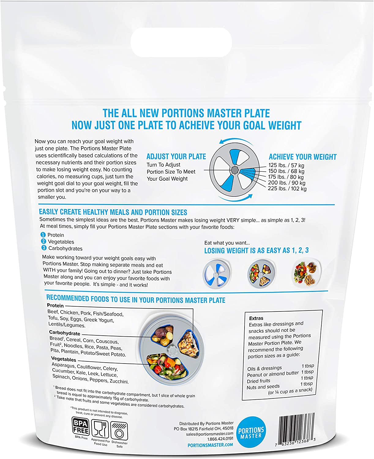 NO COUNTING CALORIESThe Portions Master Plate makes losing weight easier. Simply dial in your desired weight and your plate will adjust the portion sizes automatically. | SCIENTIFICALLY RESEARCHEDPortions Master partnered with a group of doctors and nutritionists to identify the perfect portion size you need for your targeted weight goal. | NO MACRO MATHTargeting carbs, proteins and fats, Portions Master already worked out the math and science for you so all you need to do is select your goal weight and fill the Portions Master Plate compartments. | CONVENIENT PORTION CONTROLStop making separate meals and start eating with those you care about. Simplify place the Portion Plate on your plate and fill your portions. |