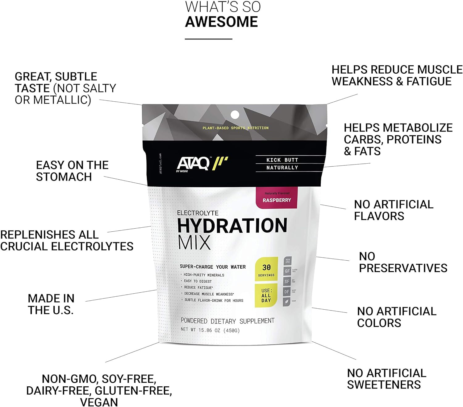 - DELICIOUS & EASY TO USE: Incudes (1) 450g pouch, 30 servings of ATAQ Raspberry Hydration Mix. Enjoy a subtle Raspberry flavor by adding 1 scoop of our soluble powder to 12 fl oz of water. Use 2 for larger bottles or if stronger flavor or higher electrolyte amount is preferred.