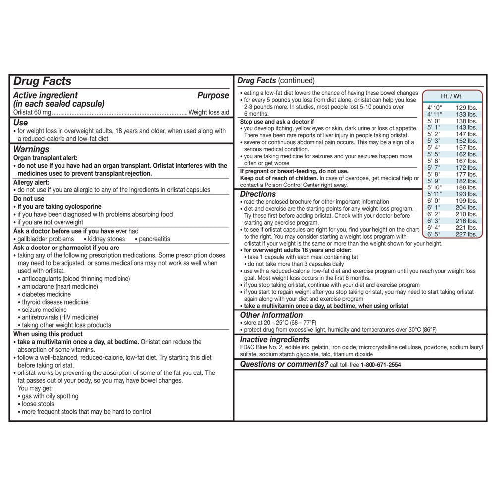 alli (orlistat 60 milligram capsules) is your smart edge for weight loss. Among weight loss products, it's the only FDA-approved over-the-counter weight loss aid. Orlistat, the active ingredient in alli, is a lipase inhibitor and works by binding to specific enzymes that break down fats. As a result, about 25 percent of the fat you consume is not absorbed and passes through the digestive system. Since the calories associated with this unabsorbed fat are not used, the number of calories that enter your system is reduced. You're ready with alli by your side. alli (orlistat 60 milligram capsules) is a weight loss aid for overweight adults, 18 years and older, when used along with a reduced-calorie and low-fat diet. Read and follow label directions.alli orlistat 60 mg capsules weight loss pill refill pack (120 capsules) contains: A read me first brochure and up to 40-day supply. It is designed for people who are already using alli and have previously purchased the starter pack. Helps you lose more weight than dieting alone. Read the enclosed brochure for other important information. Diet and exercise are the starting points for any weight loss program.