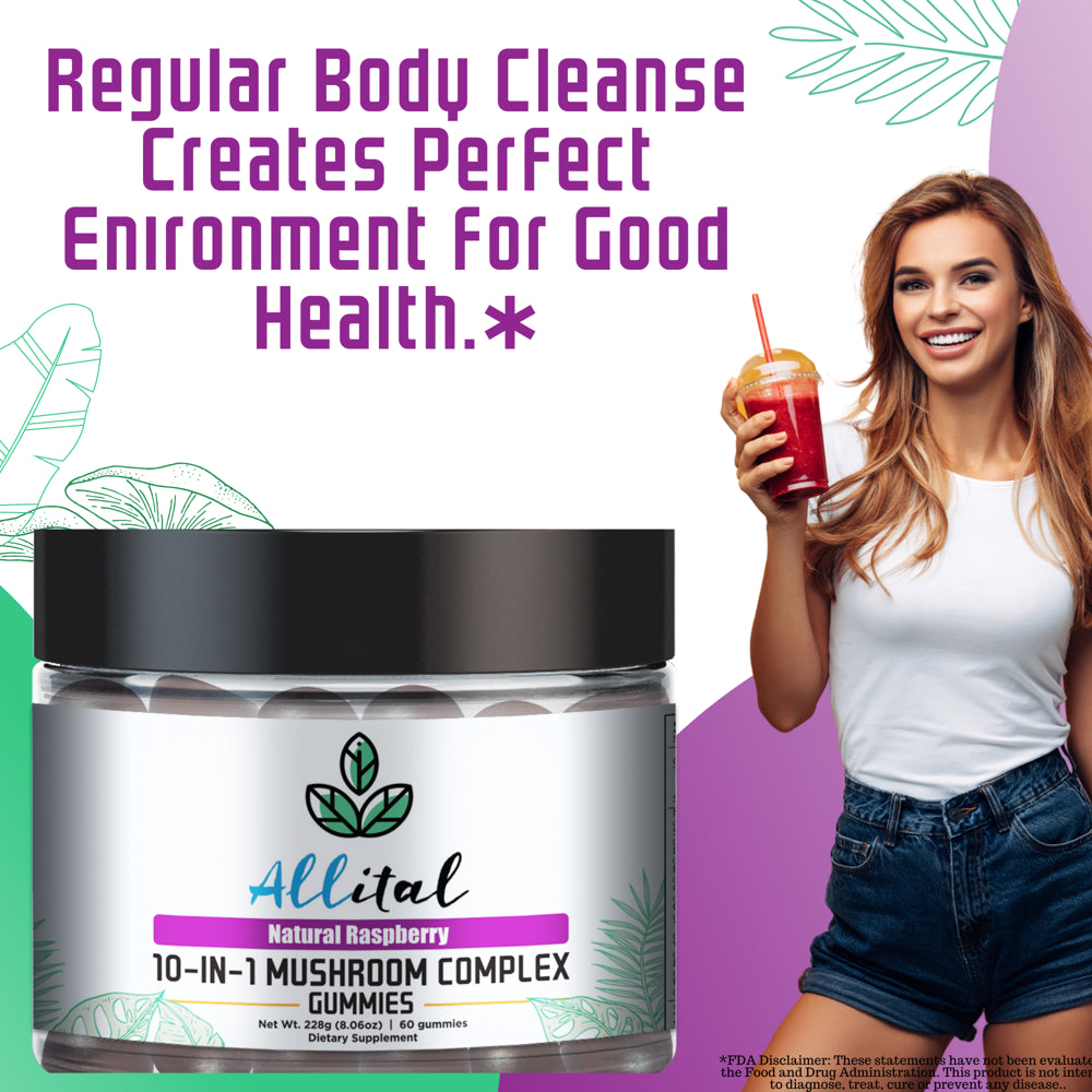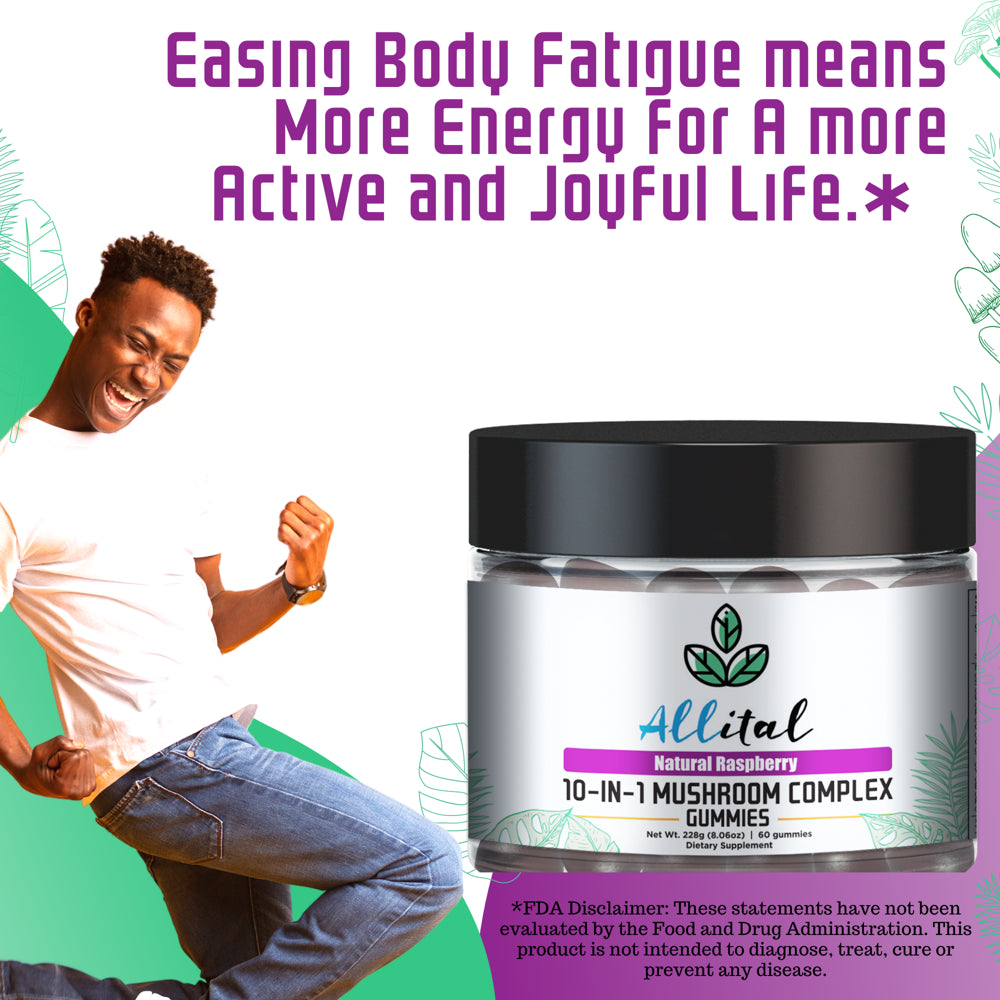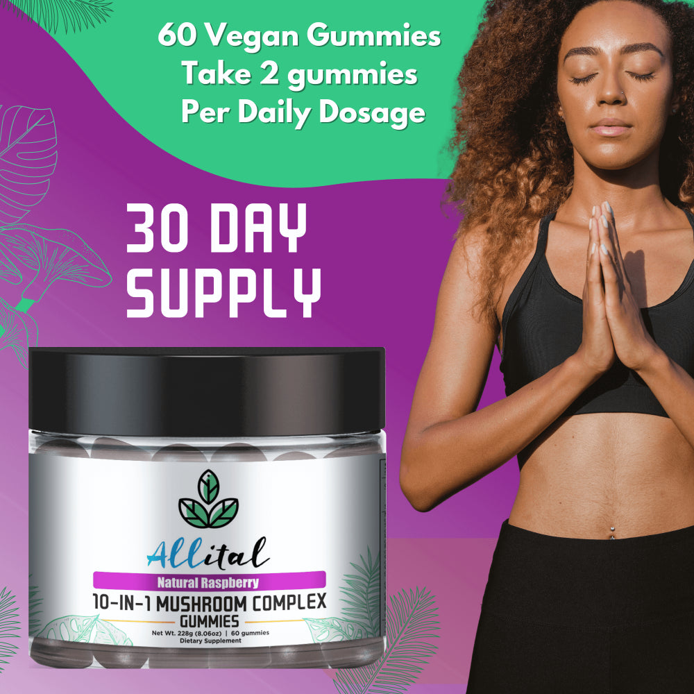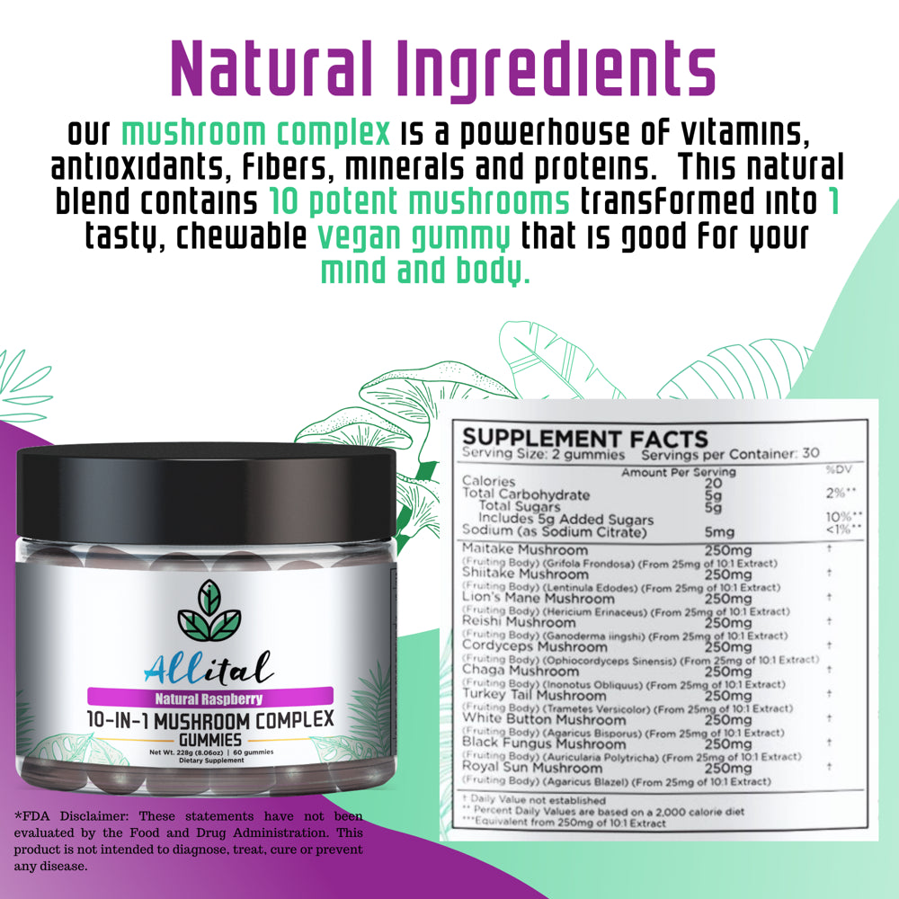 - WHY CHOOSE ALLITAL 10-IN-ONE MUSHROOM COMPLEX GUMMIES. They are made of an equal blend of 10 varieties of powerful natural mushrooms, Royal Sun, White Button, Chaga, Turkey Tail, Cordyceps, Shiitake, Reishi, Lion’s Mane, Maitake and Cloud Ear. Our mushroom complex has a potency of 2500mg per serving (2 per day) with 1 month supply of 60 tasty, easy to swallow, natural raspberry flavoured chewables.