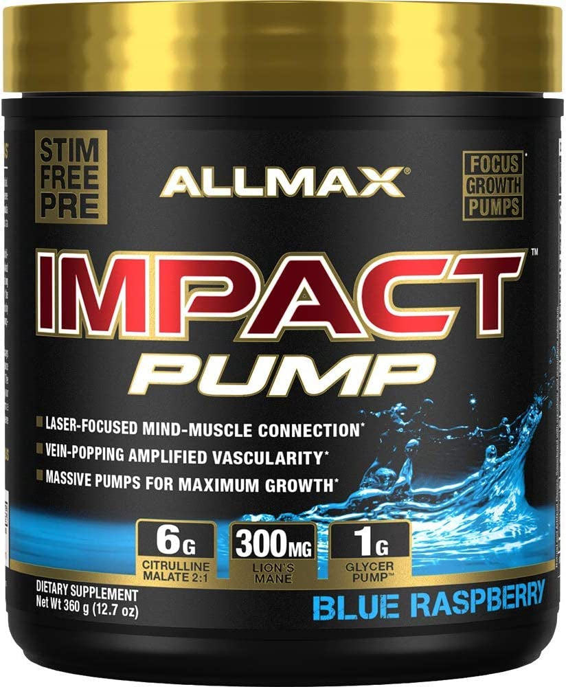ALLMAX IMPACT PUMP, Blue Raspberry - 360 G - Stim-Free Pre-Workout Formula - Boosts Pumps & Mind-Muscle Connection - with Citrulline Malate & Lion’S Mane - up to 30 Servings - Blue Raspberry / 30 Servings (Pack Of 1) is backordered and will ship as soon as it is back in stock.