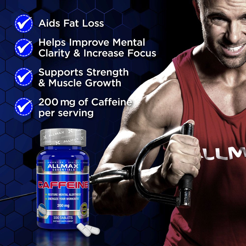 Allmax Caffeine 200mg, 100ct Tablets can provide quick energy, improve strength, improve focus and mental clarity. Each serving contains 200mg of caffeine which is as much as in a large cup of coffee. Allmax Caffeine can create a thermogenic benefit stimulating and energizing your body. Combining caffeine supplementation with a good training session can increases fatty acid oxidation and promote fat burning! Caffeine is included in many thermogenic fat loss and pre-workout supplements. Caffeine is an alkaloid and is found in guarana, kola nuts, coffee, tea and cocoa beans. It is the most popular drug in the world and is a powerful stimulant to the central nervous system. After caffeine is consumed, it is absorbed into the bloodstream and other body tissues. It takes about half an hour to experience peak concentration in the body. Research has shown that caffeine supplements help improve energy levels, mood, various aspects of brain function, and fat-burning. Caffeine bodybuilding supplements have also been shown to benefit endurance and strength athletes as well as trained athletes when performing HIIT (high intensity interval training). For bodybuilders and fitness enthusiasts alike, caffeine supplements are the cornerstone of any successful training and nutrition program.