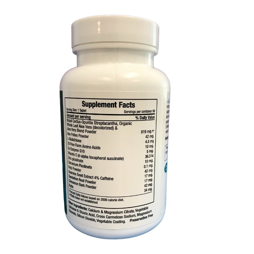 Aloe Boost, Nopal Cactus & Whole Leaf Aloe Vera, Tablets, Bottle 90 CT A Nutritional Dietary Supplement. Nopal cactus & whole leaf aloe vera. Minerals, amino acids & herbal base. Supports daily energy. Aids in blood sugar balance. Digestion function. Weight maintenance. Nopal cactus. Aloe Life Aloe Boost is a combination of traditional herbs and life cell nutrients that together support energy and healthier blood sugar levels. Both the Nopal Cactus (opuntia streptacantha) and the whole leaf aloe vera (barbadensis miller) plant have been safely used by ancient civilizations for digestion, pancreas health support and in recent years for weight maintenance. The CoQ-10 enzyme is required for cellular energy blended with bee pollen, 20 free form amino acids, suma (Brazilian ginseng), glutathione (antioxidant) and chromium picolinate (glucose regulator) that together optimize health! Satisfaction guaranteed! Since 1991. Member of NNFA & IASC since 1994. www.aloelife.com. (This statement has not been evaluated by the Food and Drug Administration. This product is not intended to diagnose or treat disease). Serving Size: (1) tablet taken with meals, 1-3 times daily as desired with water, food, beverage or as directed by a physician. Note: Use caution with diarrhea and bee sting sensitive people. 90 tablets San Diego, CA 800-414-ALOE