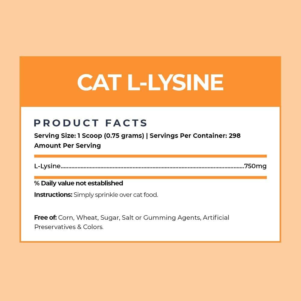 - 100% pure, all-natural L-lysine without any buffers to help boost your cat’s immune system and fight off infections.