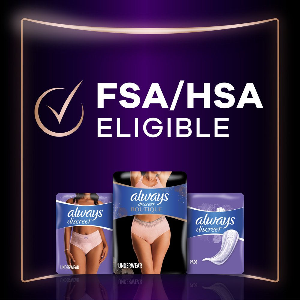 - Ladies' disposable incontinence and postpartum underwear are FSA and HSA eligible