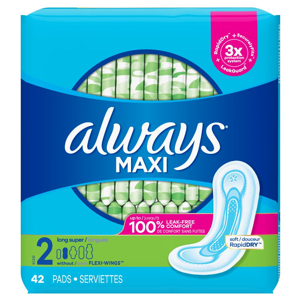 Always Maxi Daytime Pads without Wings, Size 2, Long, Unscented, 42 Ct