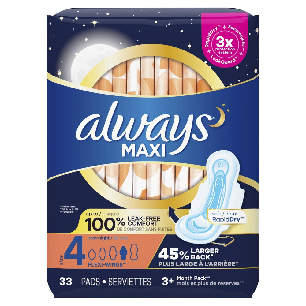 - Always Maxi Pads with Wings, Size 4, Overnight, Unscented, 33 Ct