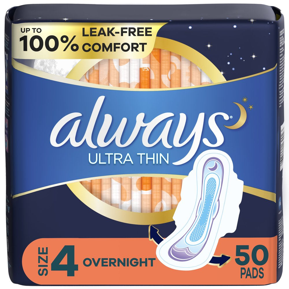 - Always Ultra Thin Overnight Pads with Wings, Size 4, Overnight Absorbency, 50 CT