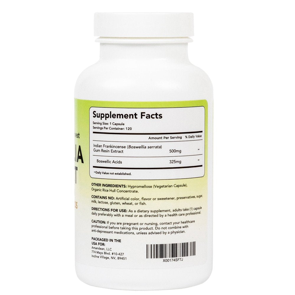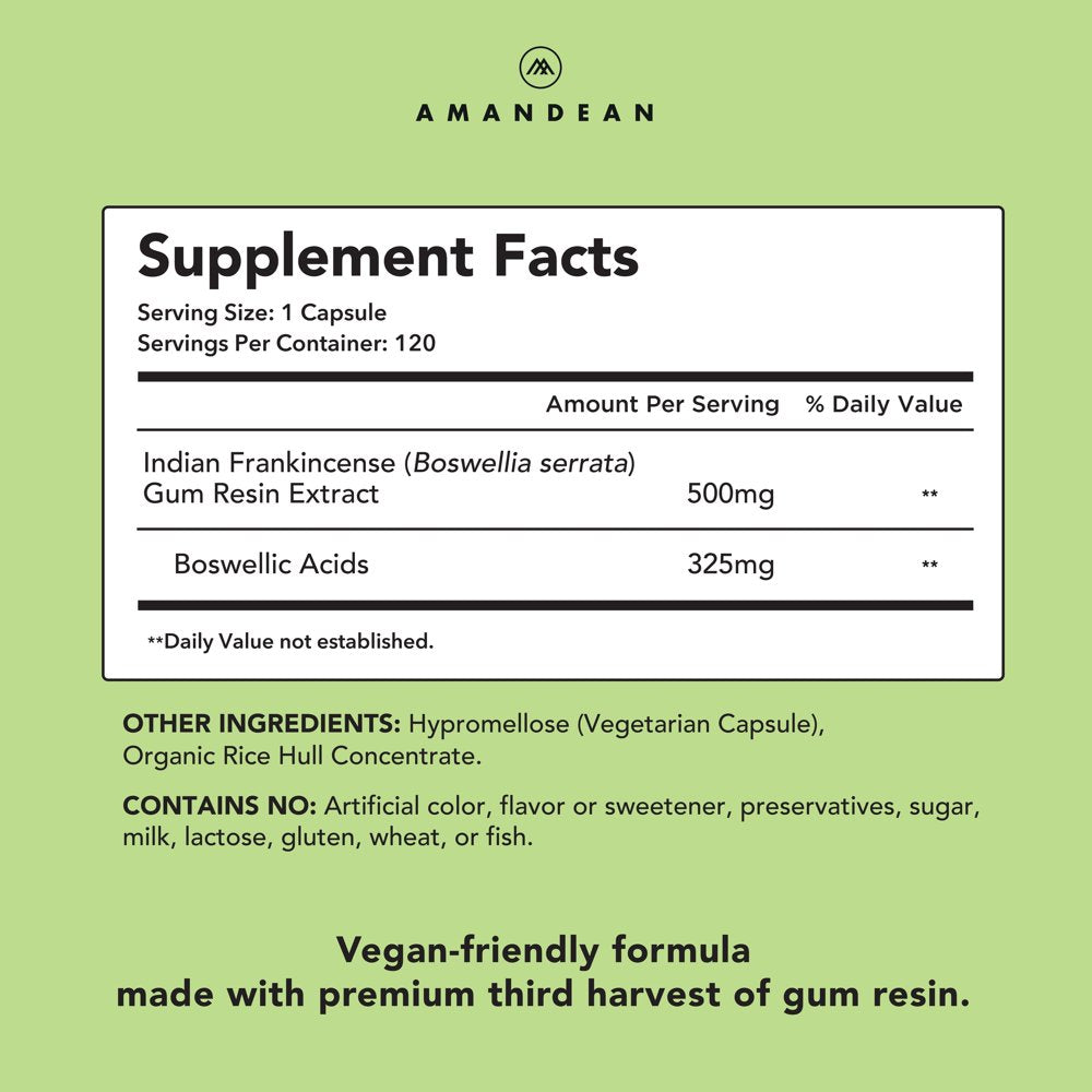 | Product Name | Amandean Boswellia Serrata Extract. 500mg 120 Veggie Capsules. 65% Boswellic Acids with AKBA. Natural Ayurvedic Supplement (Indian Frankincense). Premium 3rd Harvest. |