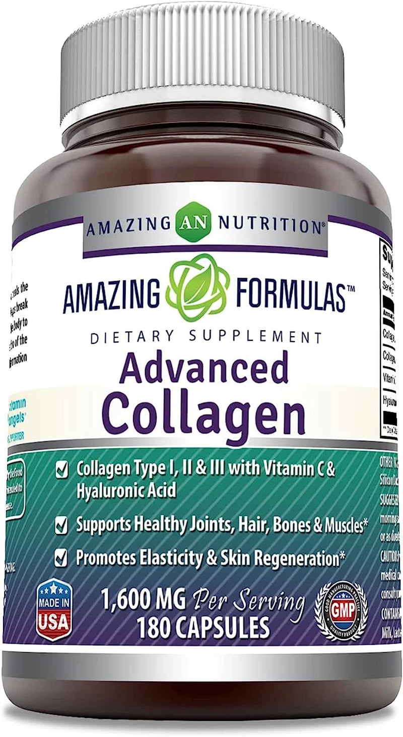 Amazing Formulas Advanced Collagen 1600Mg per Serving Supplement | Collagen Type I, II & III with Vitamin C & Hyaluronic Acid | 180 Veggie Capsules | Non-Gmo | Gluten Free | Made in USA