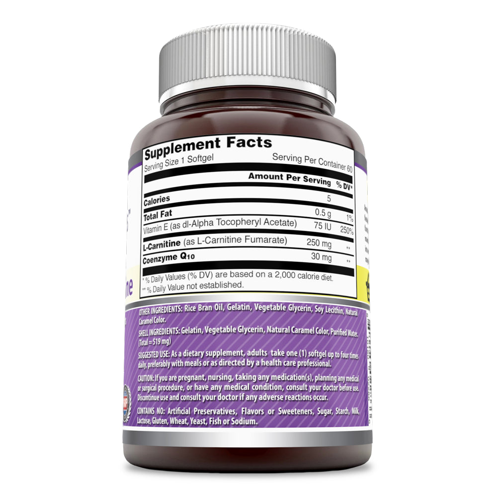 - Amazing Formulas Coq10 + L Carnitine Supplement - Provides 30mg Coenzyme Q10 Plus 250mg L Carnitine Fumarate Per Soft Gel - Two Antioxidant Nutrients In One Formula - Supports Cardiovascular Health, Cognitive Function & Energy Production