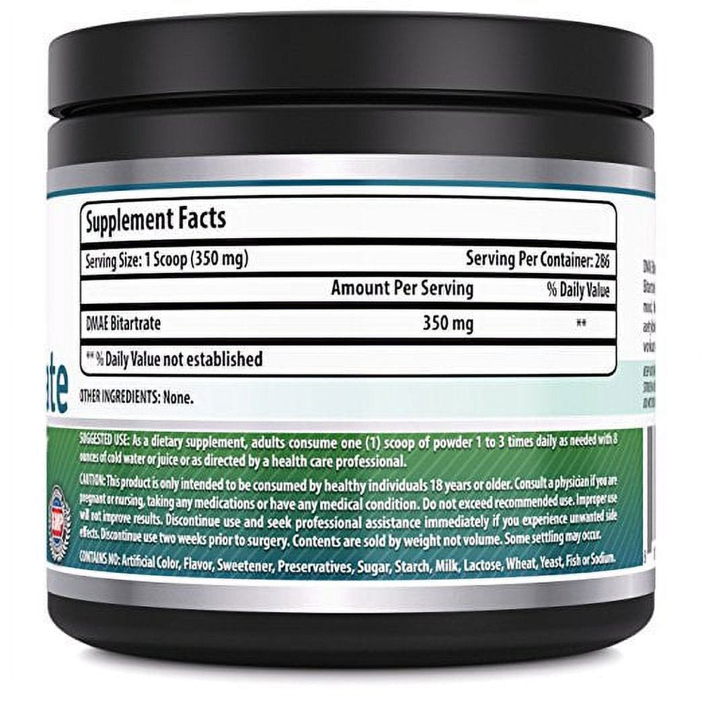 - PURE DMAE Our DMAE powder is made from nothing but DMAE bitartrate! With no additives, preservatives or fillers of any kind, it gives you maximum benefits. It is free of sugar, starch, milk, lactose, wheat, yeast, fish or sodium.
