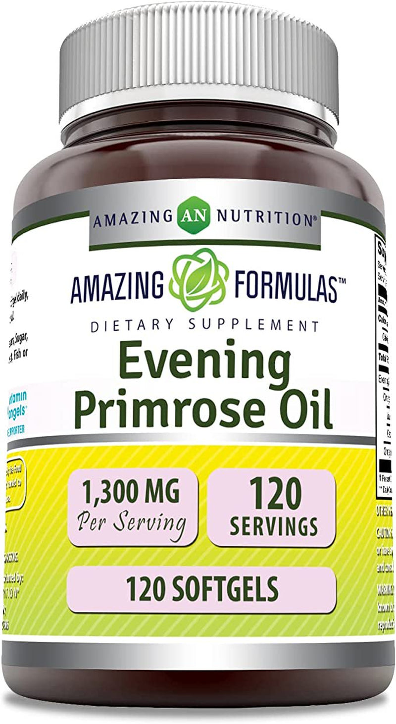 AMAZING FORMULAS EVENING PRIMROSE OIL DIETARY SUPPLEMENT-1300 MG, 120 SOFTGELS Evening Primrose is a beautiful yellow flower that growsthroughout North America. For centuries, the oil from the seeds of the planthave been used for its numerous health. Evening Primrose oil is rich in: Omega6 Fatty Acids (such as Linoleic Acid & Gamma Linoleic Acid), Omega 9 FattyAcids (such as Oleic Acid), Anti-Inflammatory Compounds, Vitamin E etc.Amazing Formulas Evening Primrose Oil dietary supplement is made Non-GMO,Hexane Free, Cold Pressed Evening Primrose seed oil. Each softgel provides1300milligrams of pure and concentrated oil. It is standardized to contain 10%Gamma Linoleic Acid (GLA) for better results. BENEFITS OF EVENING PRIMROSE OILANTI-INFLAMMATORY PROTECTION Evening Primrose oil is an excellent naturalanti-inflammatory. The high GLA content of our evening primrose oil dietarysupplement may help to alleviate inflammation symptoms such as joint, nerveand muscle pains. WOMEN���S HEALTH For centuries Evening Primrose Oil isconsiders as a natural remedy to alleviate unwanted PMS and Menopause symptomsbecause of its essential fatty acid content. Getting enough omega-6 fattyacids, such as LA and GLA may support overall hormonal function within thebody. SUPPORTS HEALTHY SKIN Gamma Linoleic Acid (GLA) is necessary forideal skin structure and function. Because the skin can���t produce GLA on itsown, taking GLA-rich Evening Primrose Oil dietary supplement may help topromote overall skin health. It may help to smooth skin by promoting itselasticity, moisture, firmness etc. Read more AMAZING FORMULAS We believe thatbalanced nutrition is the key for healthy living. We are passionate aboutbringing you the finest selection of products which can perfectly complement ahealthy diet and active lifestyle. We are constantly expanding our line-up offormulas to be a one-stop shop for all your health and wellness needs. OURMISSION & VALUES We believe nothing is more important than your health. Ourgoal is to get you living well and feeling better and we want to make it easy!We understand that getting all the nutrients you need on a daily basis can bea difficult task. It can seem daunting to incorporate the recommended amountof fruits and vegetables, high-fiber, whole grains, healthy fats and leanprotein into your busy day. Amazing Nutrition has all the best vitamins tohelp you get all right nutrients daily. OUR COMMITMENT We only use ingredientsfrom suppliers that meet our stringent standards. Additionally, every singleproduct is subjected to countless quality tests to ensure purity and fullpotency. All our products are A at a GMP facility.