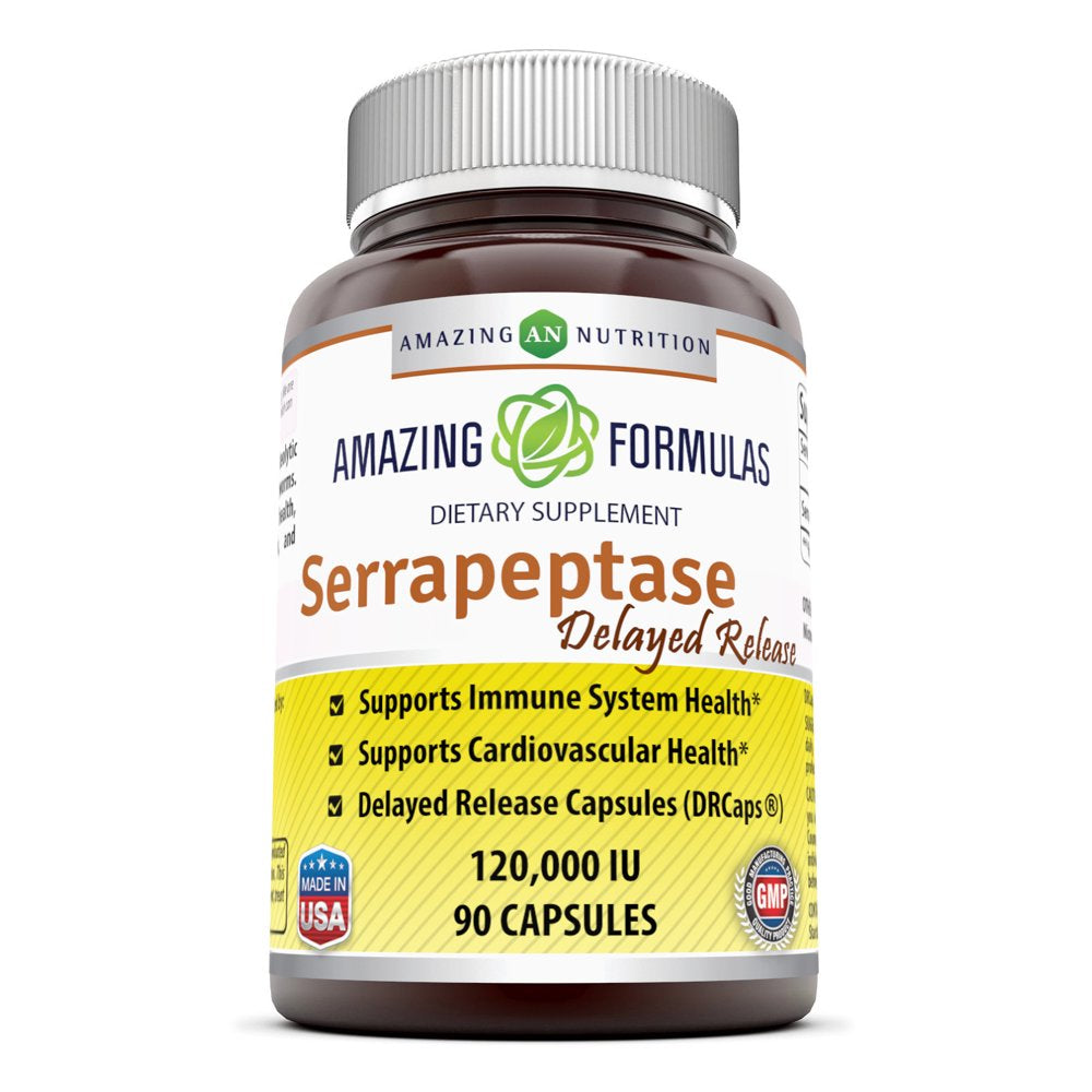 WHAT IS SERRAPEPTASE Serrapeptase Is A Proteolytic Enzyme Isolated From A Microorganism In Silkworms. It Is A Natural Anti-Inflammatory. It Supports Healthier Inflammatory Response And Immune Function, Joint Health, Connective Tissues Of The Ligaments And Respiratory System. It May Also Help Ease Pain Caused By Inflammation. CARDIOVASCULAR HEALTH Serrapeptase Supports Cardiovascular Health As It May Help To Gradually Break Plaque Build-Up In Arteries DELAYED RELEASE FOR BETTER EFFECTIVENESS We offer Serrapeptase in Delayed Release Capsules for all day support which is a safe and effective means of protecting ingredients from upsetting the stomach. Delayed Release capsules enables the enzyme to pass through the stomach unchanged, and be absorbed in the small intestine. QUALITY All Amazing Formulas products are manufactured in accordance with Good Manufacturing Practices (GMP), among the highest standards in the world. PURITY & POTENCY All our products are proudly made with Guaranteed Purity & Potency. We offer best quality products for the best value. All our products are Third Party Tested. We do not compromise on quality, our products are free of Artificial Colors, Preservatives, or Flavors WHAT IS SERRAPEPTASE? Serrapeptase is an enzyme isolated from a microorganism in silkworm. The silkworm has serrapeptase (also known as Serratio Peptidase or serratiopeptidase), a proteolytic enzyme. The silkworm produces this enzyme to digest the tough Mulberry leaves that it live on, and more importantly to emerge out of the tough cocoon by rapidly dissolving it. BENEFITS OF SERRAPEPTASE The human body needs enzymes for cellular activity. Serrapeptase is a very powerful natural anti-inflammatory agent. It induces fibrinolytic, anti-inflammatory and anti-endemic (prevents swelling and fluid retention) activity in a number of tissues. Serrapeptase's may help in easing the pain caused by inflammation including back pain, ear infections, swelling of a vein etc. due to its ability to inhibit the release of pain-inducing amines from inflamed tissues. *Serrapeptase supports healthy sinuses by helping to improve the elasticity and viscosity of the nasal mucus. * Serrapeptase supports cardiovascular health by gradually helping in reducing the plaque accumulations in the arteries. Amazing Formulas SERRAPEPTASE IS OFFERS DELAYED RELEASE CAPSULES. It is a safe and effective means of protecting ingredients from destruction within the stomach in order to be absorbed by the small intestines.