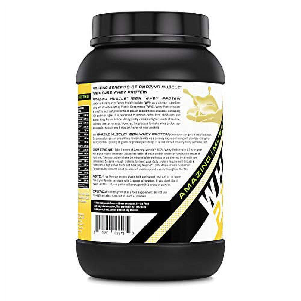 Protein is a vital nutrient in any healthy diet, but for athletes and fitness enthusiasts, it's especially important. Without enough protein, your body can't produce energy or develop lean muscle mass in response to exercise. Plus, a lack of protein can inhibit fat burning, making it harder to lose weight. The good news is that it's easy to increase the amount of protein in your diet with Amazing Muscle 100% Whey Protein Powder! While there are many whey protein supplements on the market today, Amazing Muscle 100% Whey Protein Powder stands amongst the best because: - ADVANCE FORMULA. Amazing Muscle 100% Pure Whey Protein Supplement Gives You 25 Grams Of Protein Per Serving. Our Advanced Proprietary Formula Combines Whey Protein Isolate (WPI) As A Primary Ingredient Along With Ultra Filtered Whey Protein Concentrate (WPC) To Give You Optimum Dose Of Whey Protein.* - MORE COMPLETE. Along with an optimum dose of pure whey protein in every serving our advance formula also offers a complete array of Amino acids including 5.5 grams of BCCAs (Branched chain amino acids), 4 grams of glutamic acid, all 8 Essential Amino Acids and more.* - ABSORBS FASTER. Our whey protein is low in lactose and fast absorbing.* - HEART HEALTHY. Our whey protein isolate is low in cholesterol and fat and trans fat free.* - SUGAR FREE. The whey is low in carbs, too!* - TASTIER. You'll love our whey protein powder vanilla flavor!* - INSTANTIZED. Our whey protein powder is instantized so it mixes easily in water, milk, juice or your favorite beverage to make a smooth, rich shake that's never gritty or chalky.* - STOCK UP & SAVE. Our 100% pure whey protein 5 lb tub is of great value. It contains 67 servings and can last upto 2 months.* - HIGH QUALITY. All Amazing Muscle products are manufactured in the USA at a GMP certified facility to ensure purity.* CHOOSE THE BEST!! Order Amazing Muscle 100% Whey Protein Powder now.