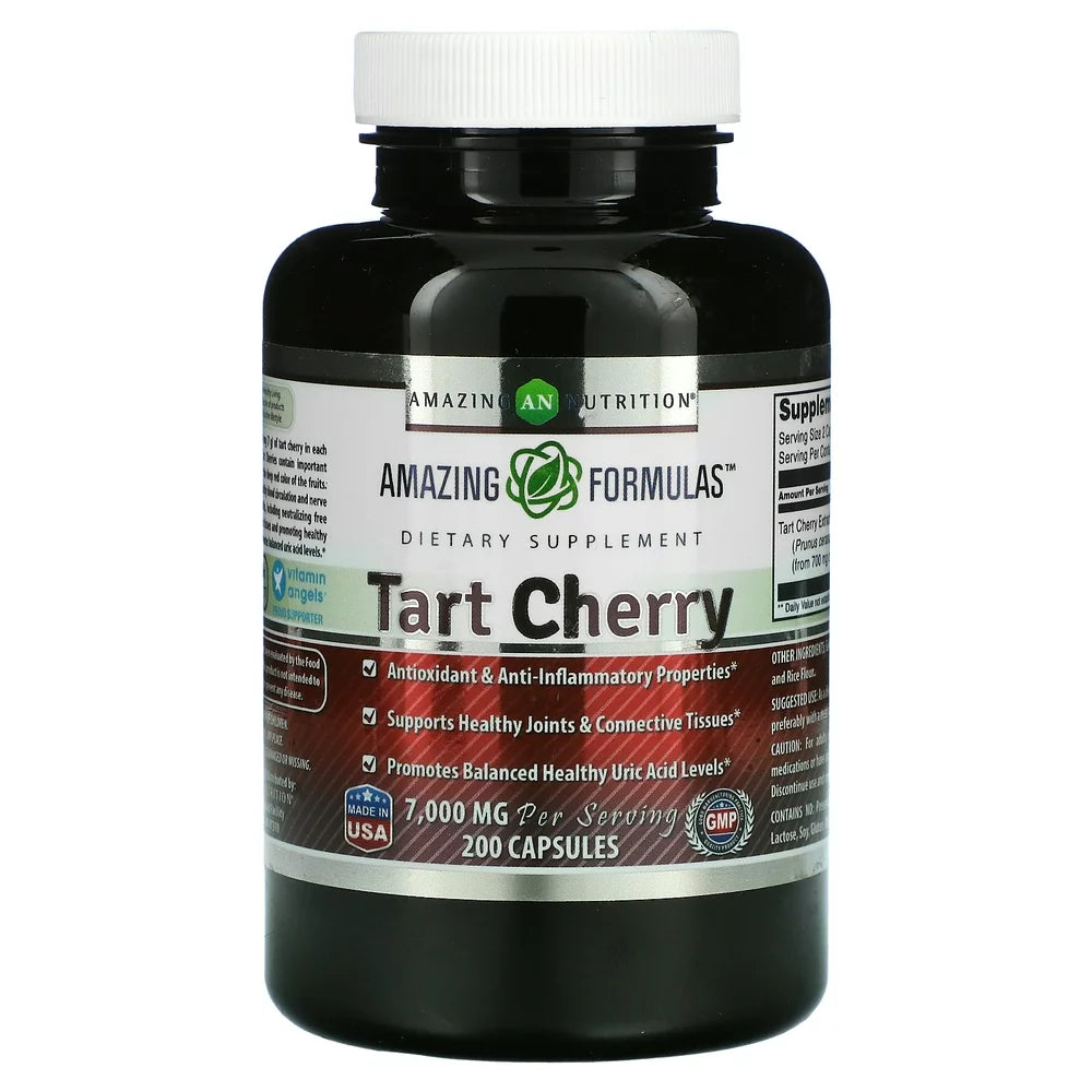 Amazing Formulas® Dietary Supplement Antioxidant & Anti-Inflammatory Properties Supports Healthy Joints & Connective Tissues Promotes Balanced Healthy Uric Acid Levels GMP - Good Manufacturing Practice Quality Product An FDA Regulated Facility We believe that Amazing Nutrition® is the key for Healthy Living. We are passionate about bringing you the finest selection of products which can perfectly complement a healthy diet and active lifestyle. Amazing Formulas™ Tart Cherry supplement provides 7,000 mg (7 g) of tart cherry in each capsule, derived from a premium quality 10:1 extract. Tart Cherries contain important phytonutrients called anthocyanins, which is responsible for the deep red color of the fruits: Anthocyanins are a type of antioxidant which encourages healthy blood circulation and nerve function. Antioxidants have a wide array of health benefits, including neutralizing free radical damage, supporting mobility of joints and connective tissues and promoting healthy aging. Tart Cherry helps to prevent inflammation, which promotes balanced uric acid levels.