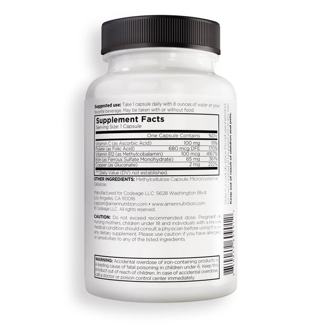Amen Iron vitamin formula features ferrous iron sulfate, copper, folate, and vitamins B12 & C in an all-in-one formula.
