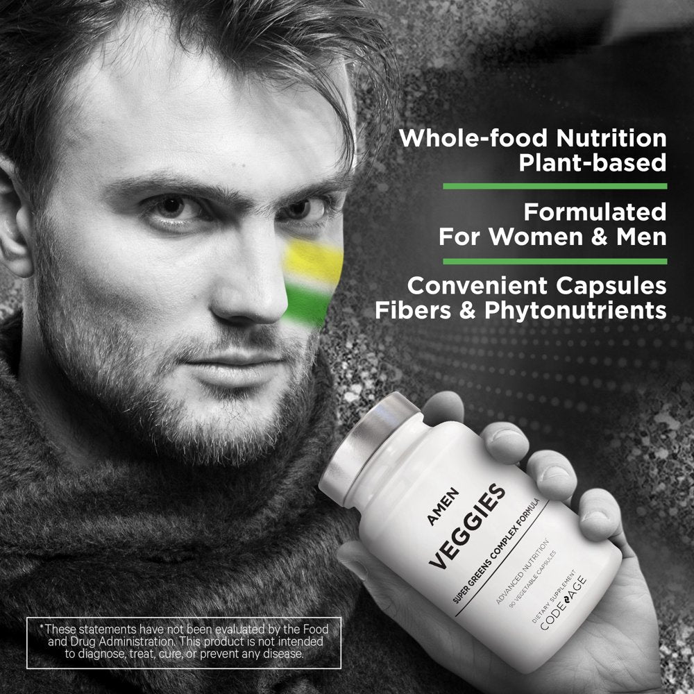 Amen Veggies greens vitamins vegan supplement provides over 10 vegetables, herbal extracts, and mushrooms extracts powders all-in-one in a convenient and easy-to-take capsule format.