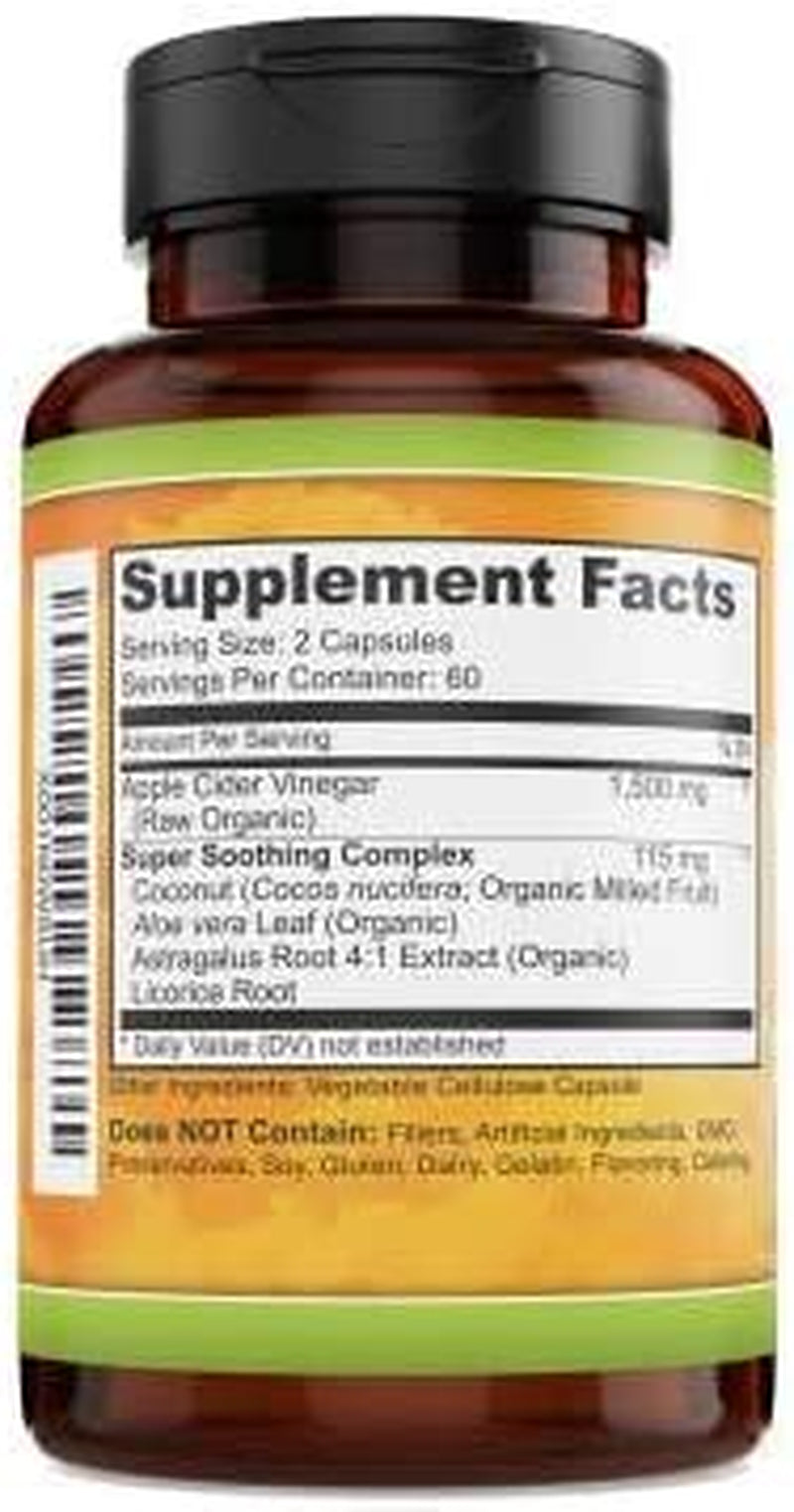 Ingredients (per serving): Raw Organic Apple Cider Vinegar with Mother (1,500 mg) and our unique Super Soothing Complex (115 mg) that contains Coconut (from organic milled fruit), Organic Aloe Vera Leaf, Organic Astragalus Root 4:1 Extract, and Licorice Root, all contained in a vegetable cellulose capsule.