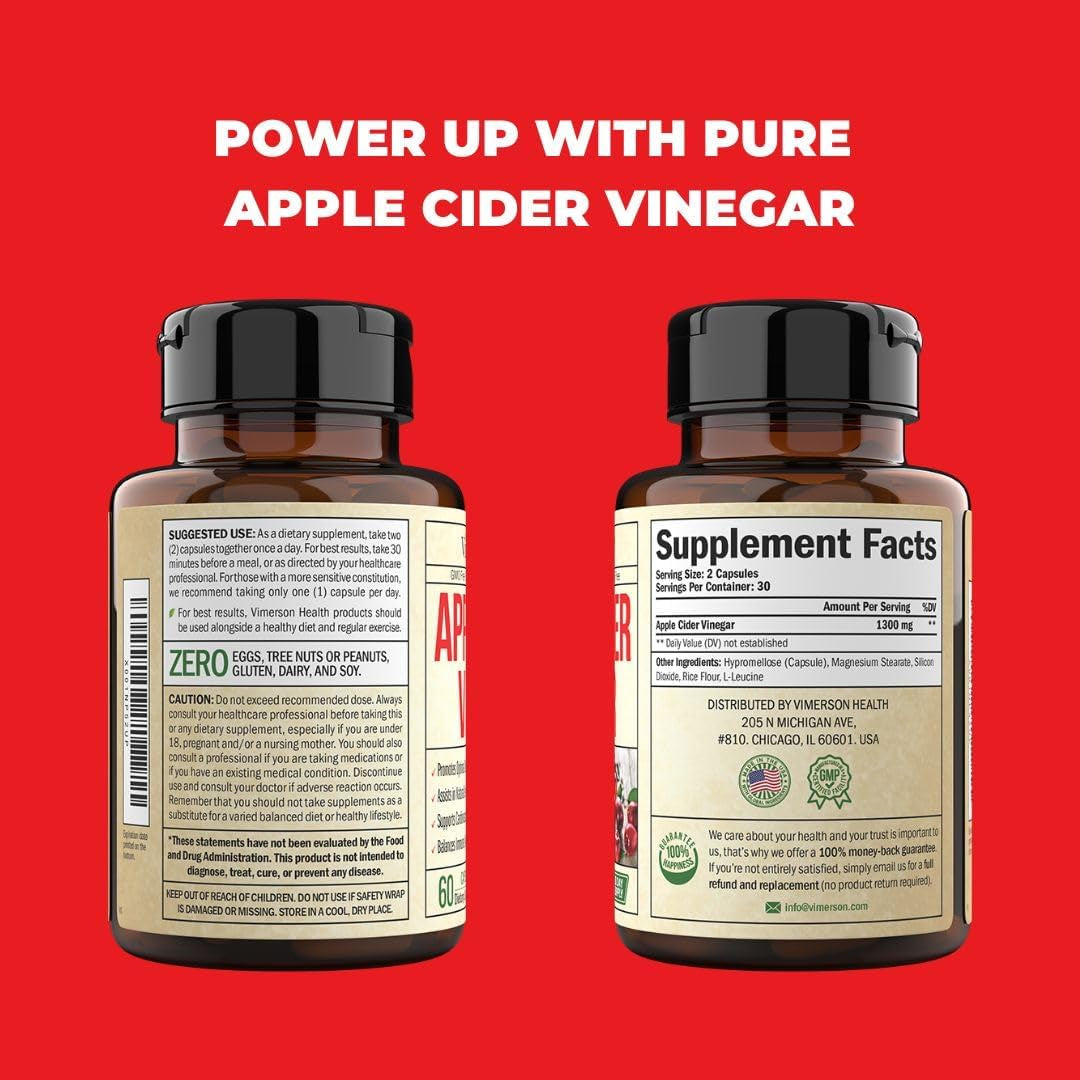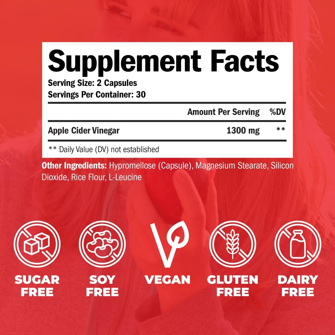 - NO NASTY AFTERTASTE: Don't let the sour taste of Apple Cider Vinegar hold you back. Enjoy all the benefits in easy-to-swallow capsules. A generous 1300mg of pure Apple Cider Vinegar in each serving, without the harsh taste or smell. Get the best of both worlds with our clean, natural formula.*