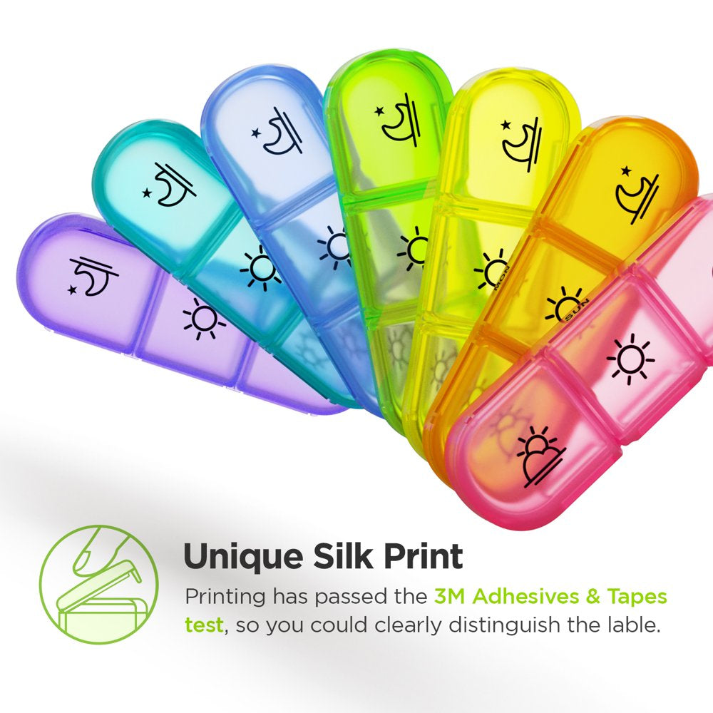 AUVON Weekly Pill Organizer, Pill Planner is a useful tool for medication management, by getting the weekly pill boxes from AUVON, the management of your pills, medications, vitamins and supplements will be easier than ever! This pill case has seven compartments with a large capacity and each compartment is labeled by the day of the week and time of the day to make it easy to organize your pills for the entire week. Each inner individual vitamin organizer in this pill planner is detachable, so you can always keep your daily medicines and supplements on hand, which is great for traveling or on-the-go use.