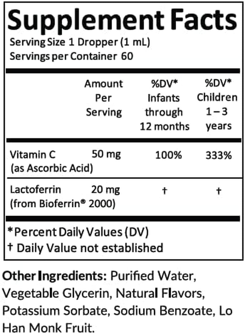 - Just One Drop Per Day – Each drop (1 mL) contains 20 mg of Lactoferrin (from BioFerrin), and 50 mg of Vitamin C (as Ascorbic acid).