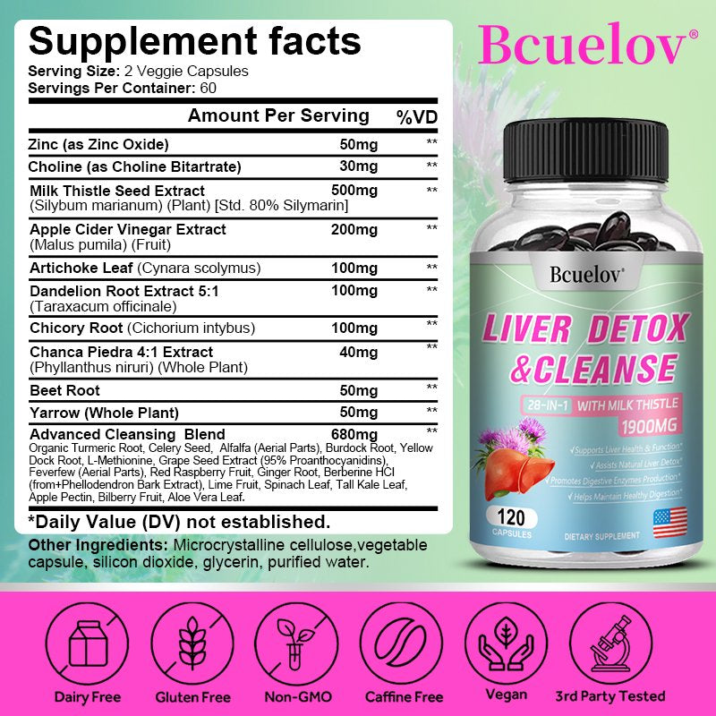 Bcuelov 28-In-1 Liver Cleanse Detox & Repair Fatty Liver Formula - Milk Thistle, Artichoke Extract, Dandelion & Apple Cider Vinegar - Liver Health Supplement Support Capsules