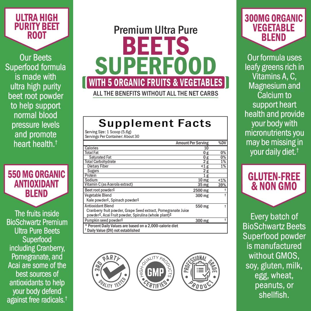 - Organic fruits & vegetables - BioSchwartz ultra pure beets superfood powder features 5 organic fruits and vegetables that help support health natural energy levels and boost stamina