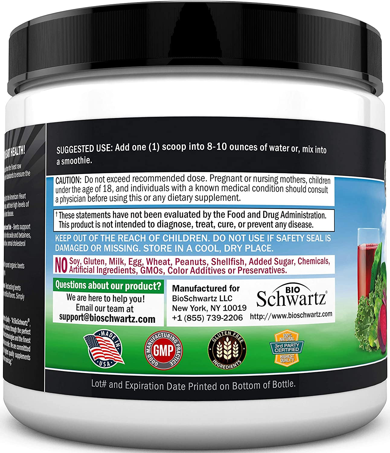 - Purity tested and allergen free - Each and every batch of BioSchwartz ultra pure beets superfood is third party tested to guarantee high purity, potency, and quality. This formula has been manufactured without GMOS, soy, gluten, wheat, peanuts, or shellfish. It is also free of preservatives, fillers, chemicals, or color additives