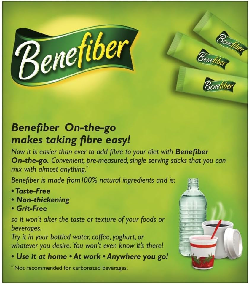 - One package of 28 unflavored powder stick packs of Benefiber On the Go Prebiotic Fiber Supplement Powder for Digestive Health, Daily Fiber Powder