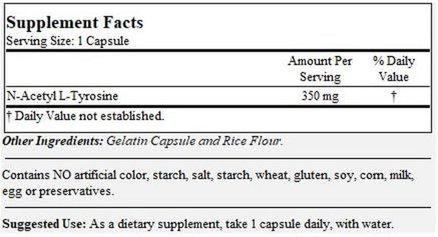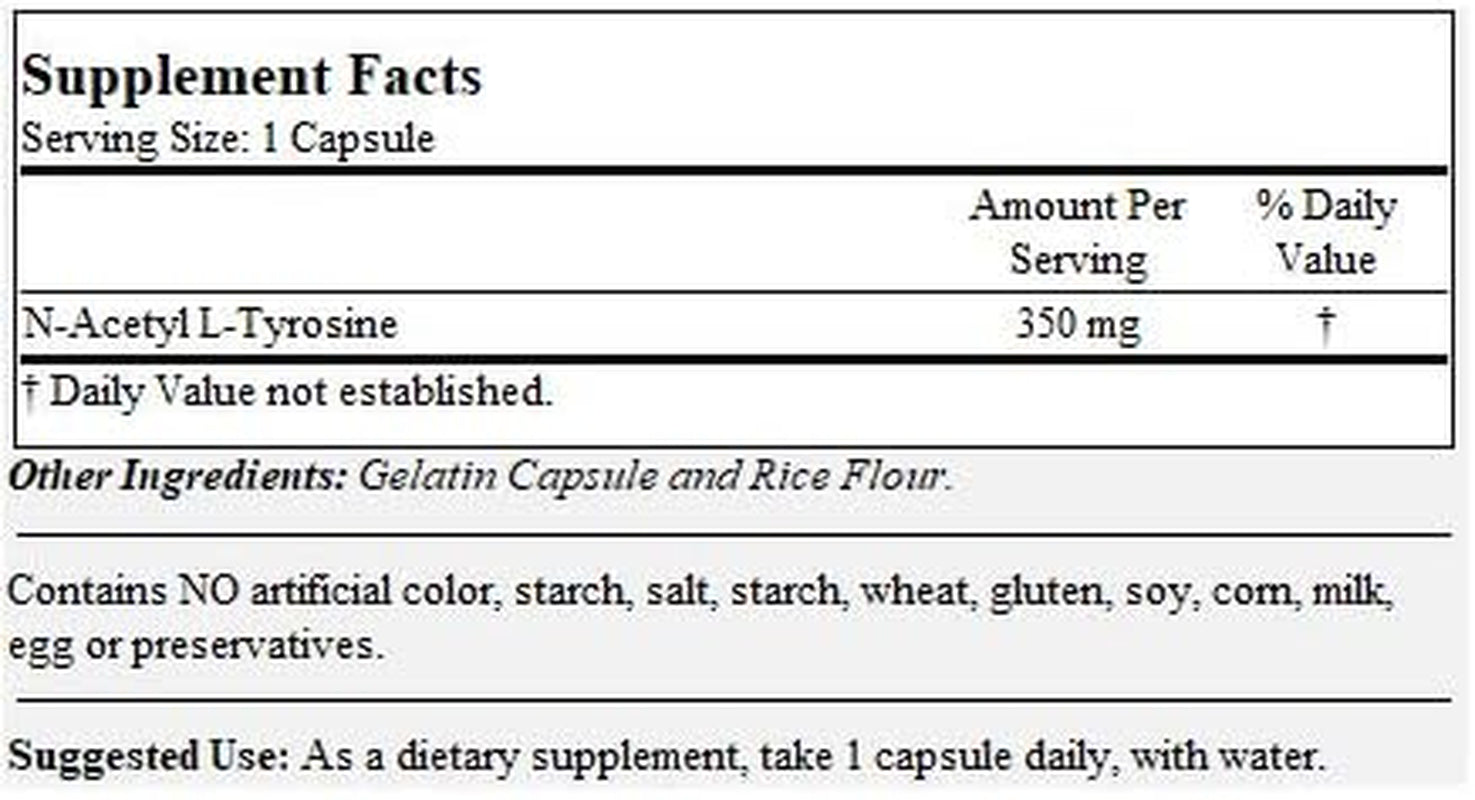 - PURE FORMULA: This N-acetyl l-tyrosine product contains no stearates, is non-GMO, gluten-free, and in an additive-free capsule. Each capsule contains 350mg of N-acetyl l-tyrosine.