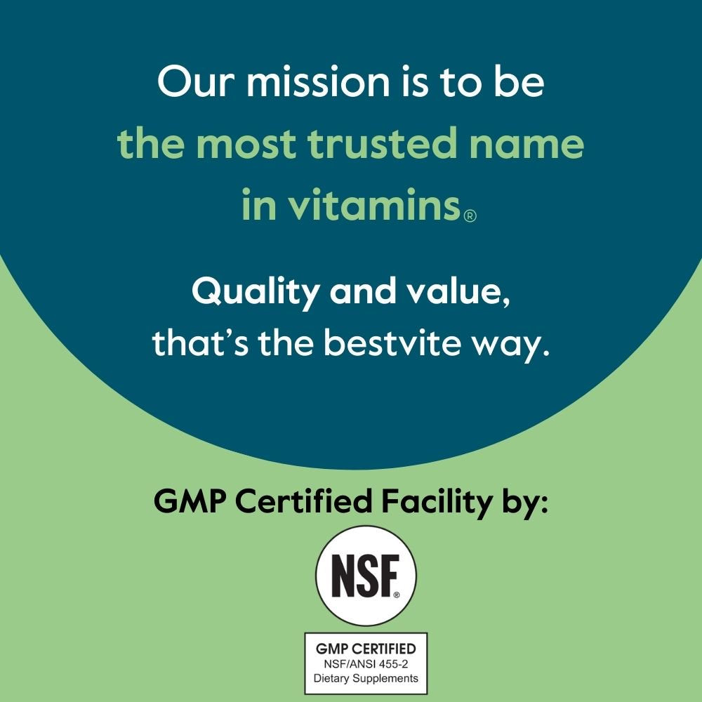 - NSF GMP CERTIFIED: Bestvite’s facility is NSF/ANSI 455-2 Dietary Supplements Good Manufacturing Practice (GMP) certified. Earning GMP certification from NSF verifies that a manufacturing facility has the proper methods, equipment, facilities, and controls in place to produce dietary supplement products.